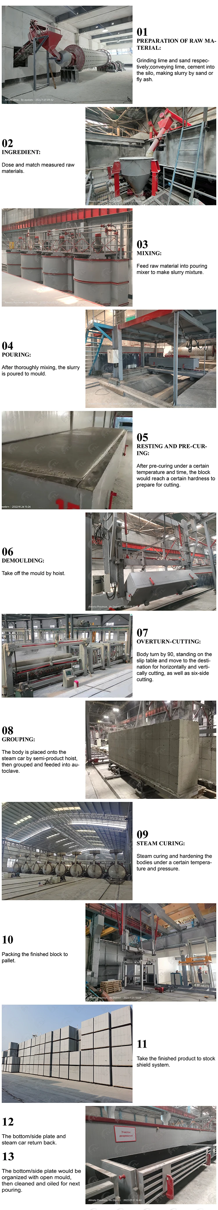 Adding some water to fly ash or silica sand to grind into slurry, add powder lime, appropriate amount of cement, gypsum and foaming agent, and then pouring into the mould after stirring, cut into various specifications of blocks or plates after foaming and curing. And then put into the autoclave by the steam car and forms into porous and light aerated concrete products under the curing of high temperature saturated steam.