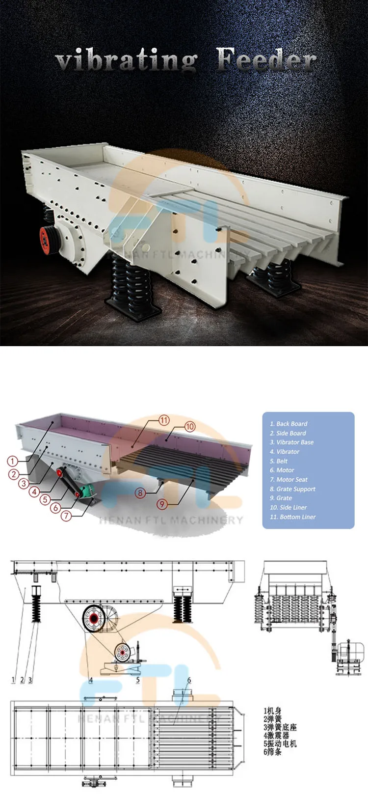 The is used to transfer the large size materials and granular materials from hopper to receiving device uniformly, periodically and continuously in the production flow and to feed materials into the crusher continuously and uniformly also to screen the materials in the sandstone production line. The vibrating feeder is widely used to match the crushing and sieving equipments in many industries including metallurgy, coal mine, mineral dressing, building material, chemical, grinding, etc.